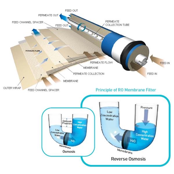 Reverse osmosis (RO) is a kind of water purification technology that uses a semipermeable membraneunder pressure applied to remove ions, molecules, and larger particles , bactaria and so on from water, and is used in both industrial processes and the production of potable water.